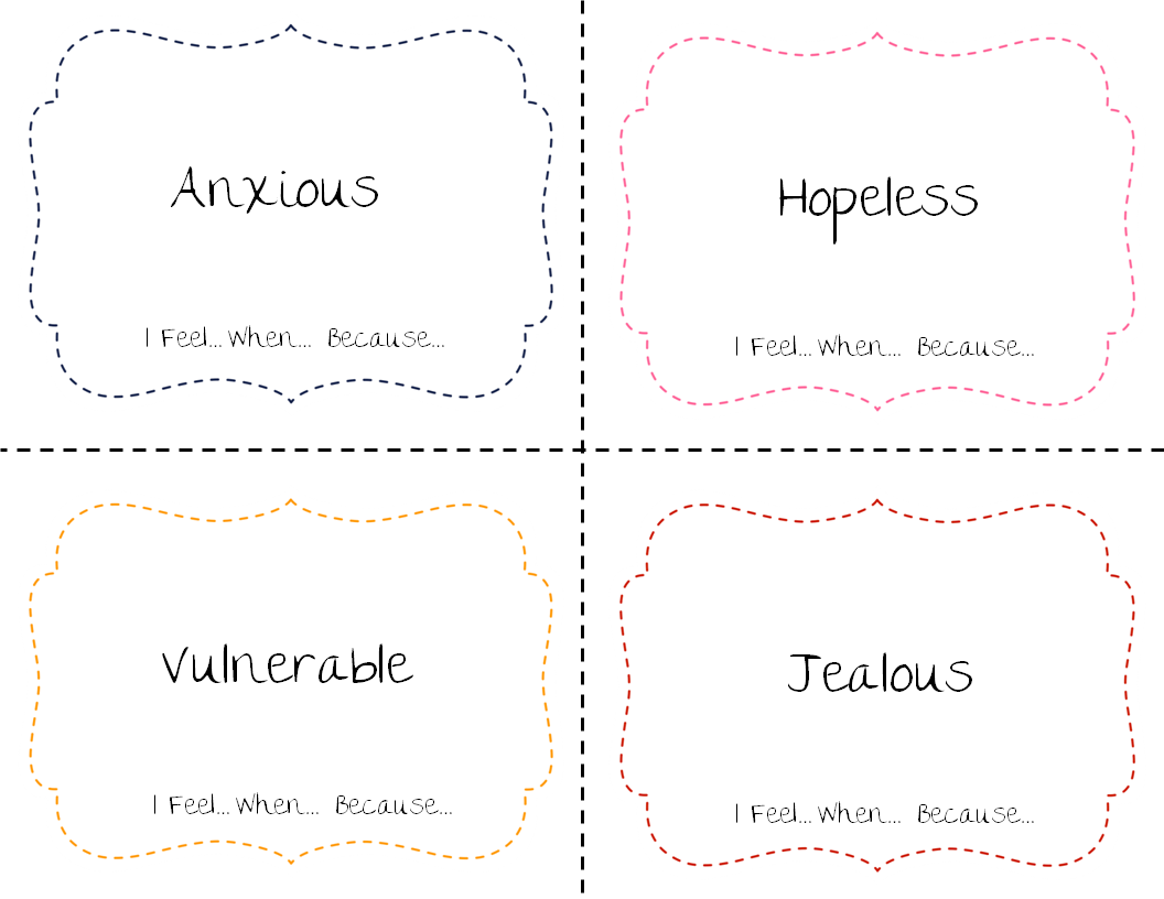 Give client a card. They will complete the following sentence using the emotion on their card: I Feel… When… Because…