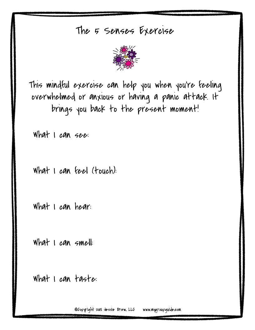 This worksheet is especially helpful for those who struggle with panic attacks or get “stuck” in their thoughts. I really like the “5 senses” exercise because it brings you back to the present moment (we tend to get lost in the past/future!)